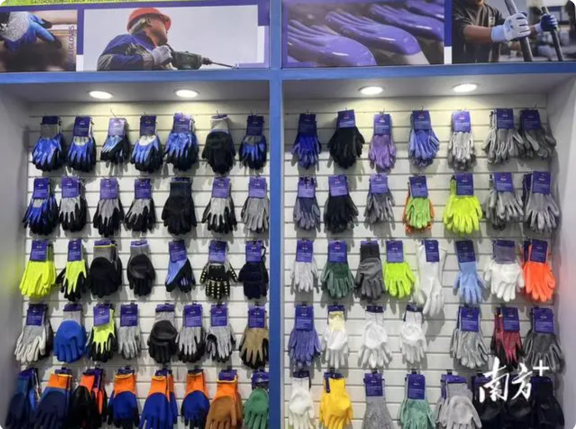 在高州市永丽劳保用品有限公司的展位,几款看起来其貌不扬的手套摆在重要位置。