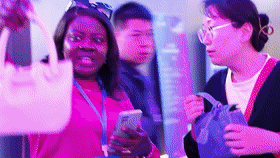 展会现场,各种款式新颖的箱包新品集中亮相,吸引外国客商纷纷上前咨询。