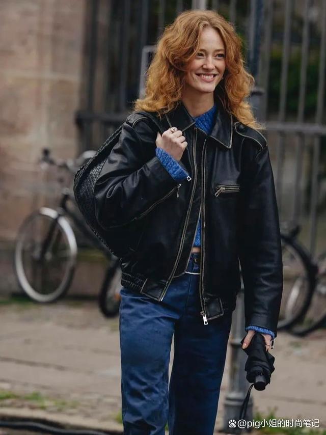 飞行员皮衣夹克,搭配牛仔裤和马丁靴,兼具舒适与帅气。