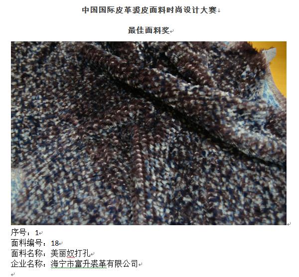 2017“真皮标志杯”中国国际皮革裘皮面料时尚设计大赛评选出最佳面料奖20名,最佳研发企业奖10名,最佳创意奖、最佳工艺奖、最佳色彩奖、最佳纹理奖、最佳毛被效应奖、最具市场潜力奖,各1名(结果统计如下,现予以公示)。